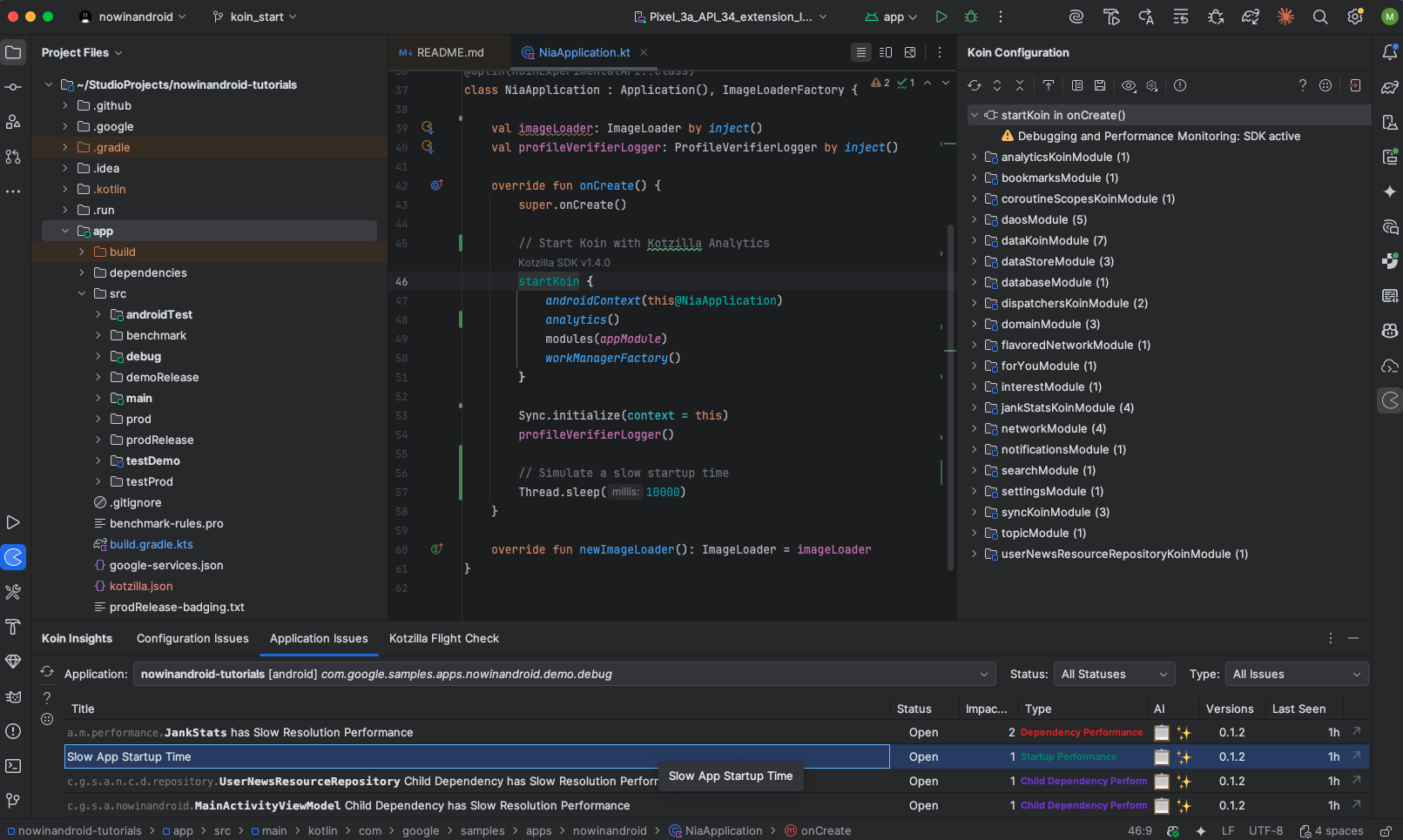 This tutorial guides you through identifying a performance issue related to your app startup time using the Kotzilla Platform.