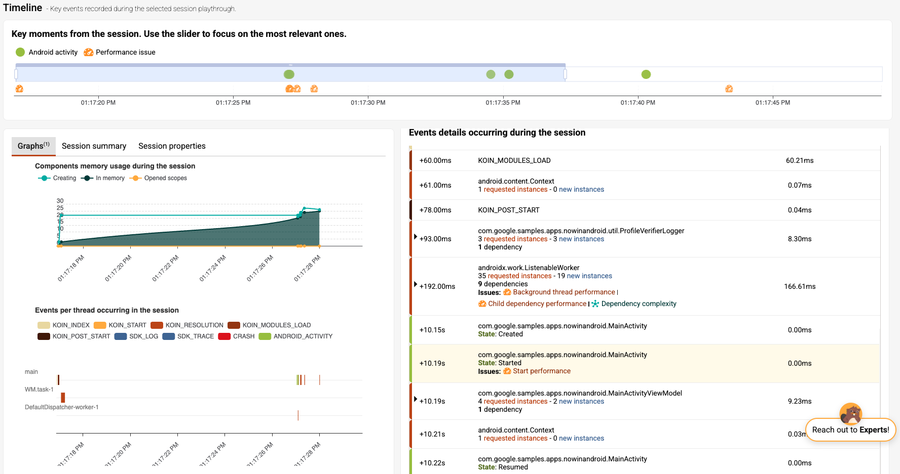 Click on the first impacted user session to drill down into the specific events and components related to the issue. This will take you directly to the Timeline View, where you will observe a 10-second delay between the Koin Modules Load event and the transition to the first screen (MainActivity).