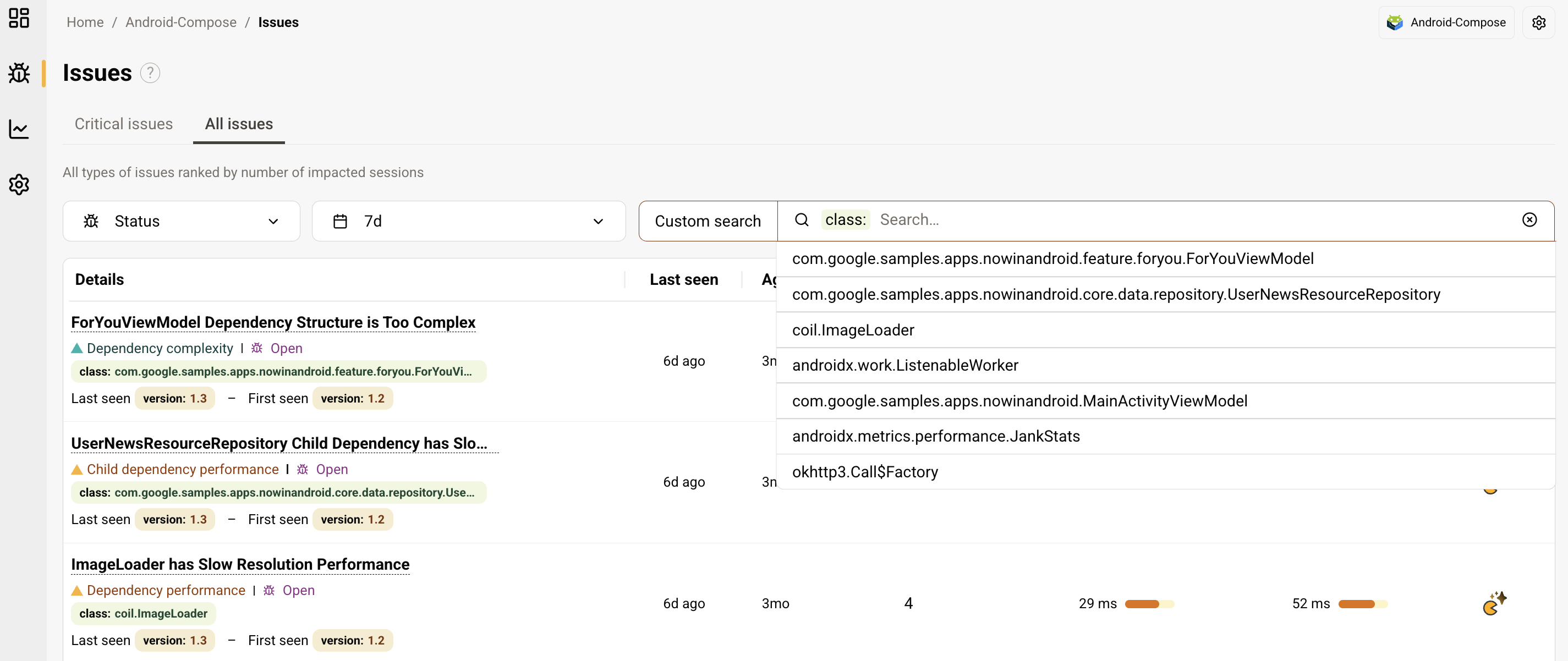 The page is composed of two views, allowing you to focus on critical issues or to get an overview of all issues detected. Both views include the complete list of issues, with filtering options by app version, issue type, impacted class, and full-text search across properties. For each issue, the view displays key information: