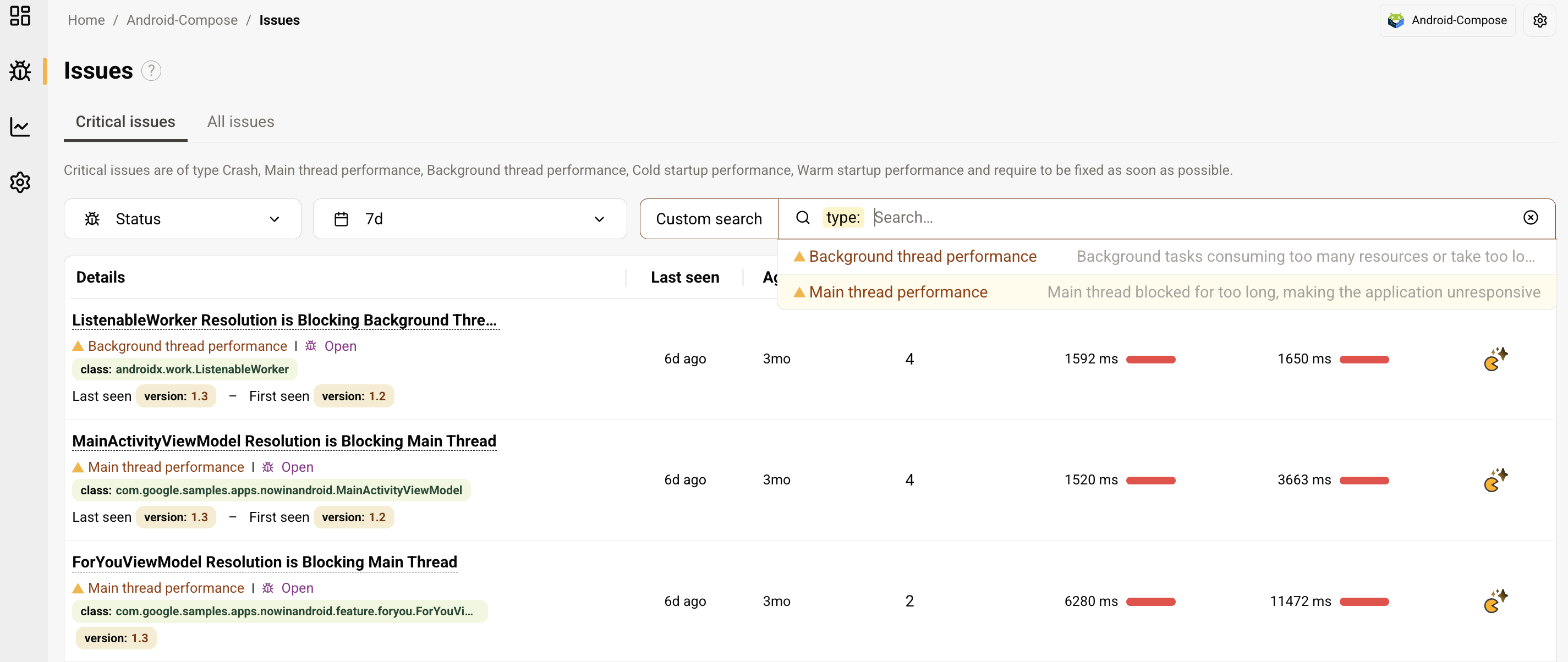 This view displays issues from the following types: Crashes, Startup performance, Main thread performance or Background thread performance.