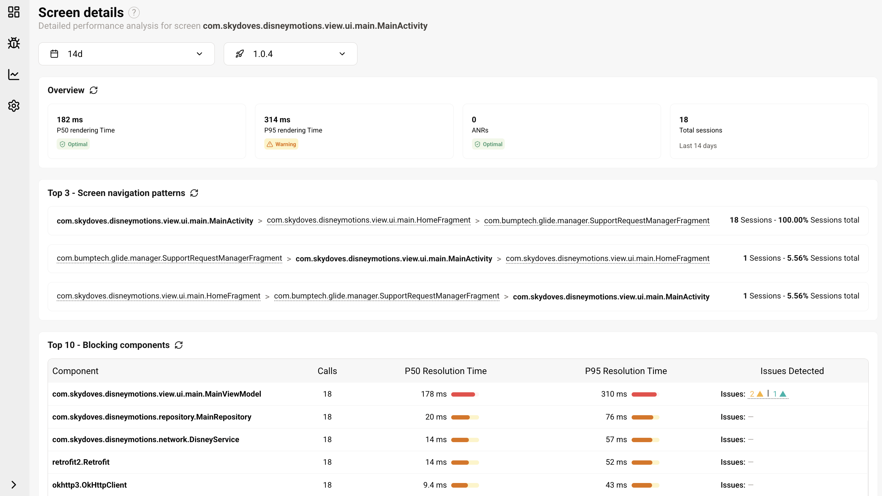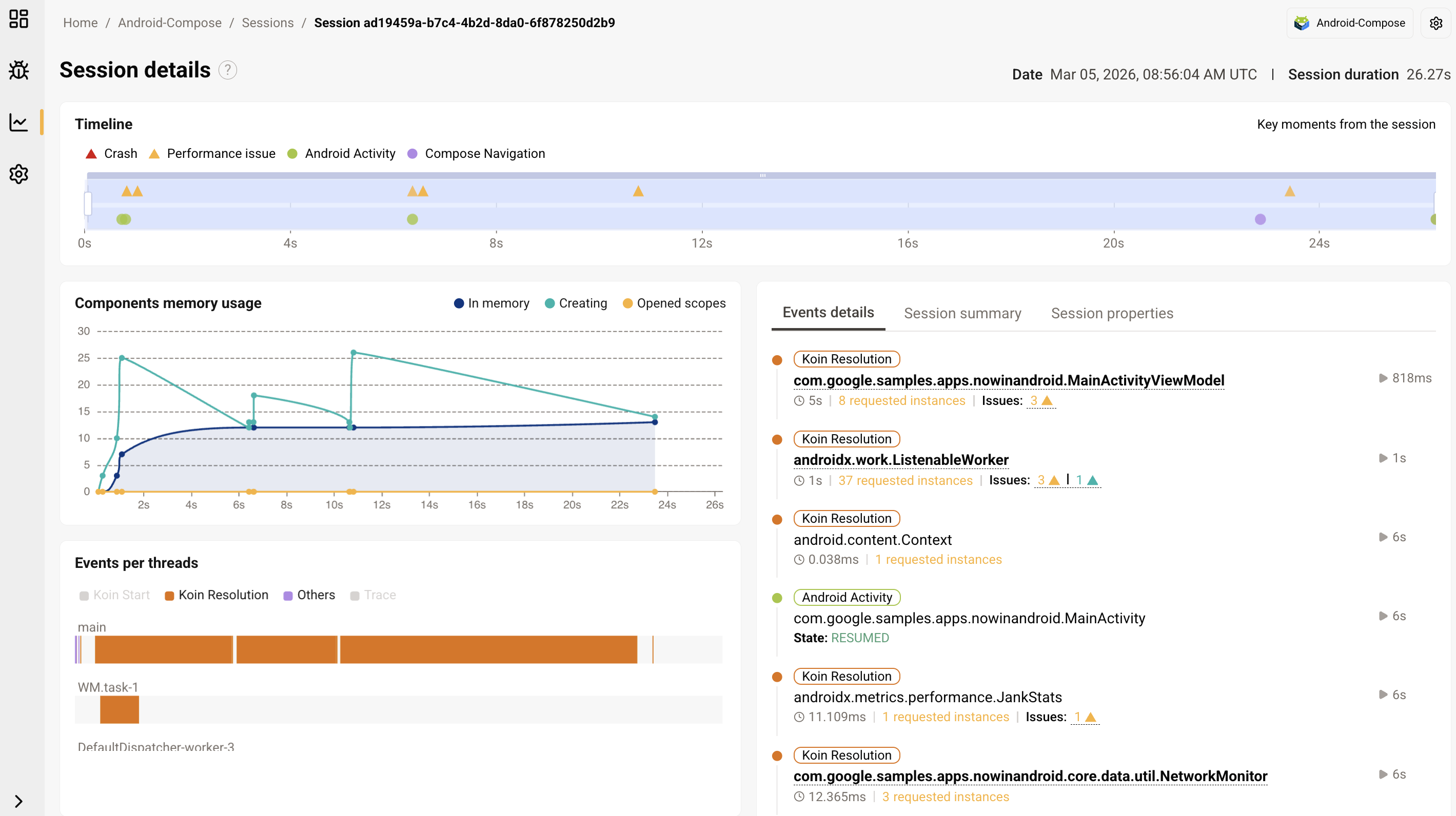 - Main thread performance issues: Components or dependencies resolutions running on the main thread for over 100ms, potentially leading to freezes or ANRs.