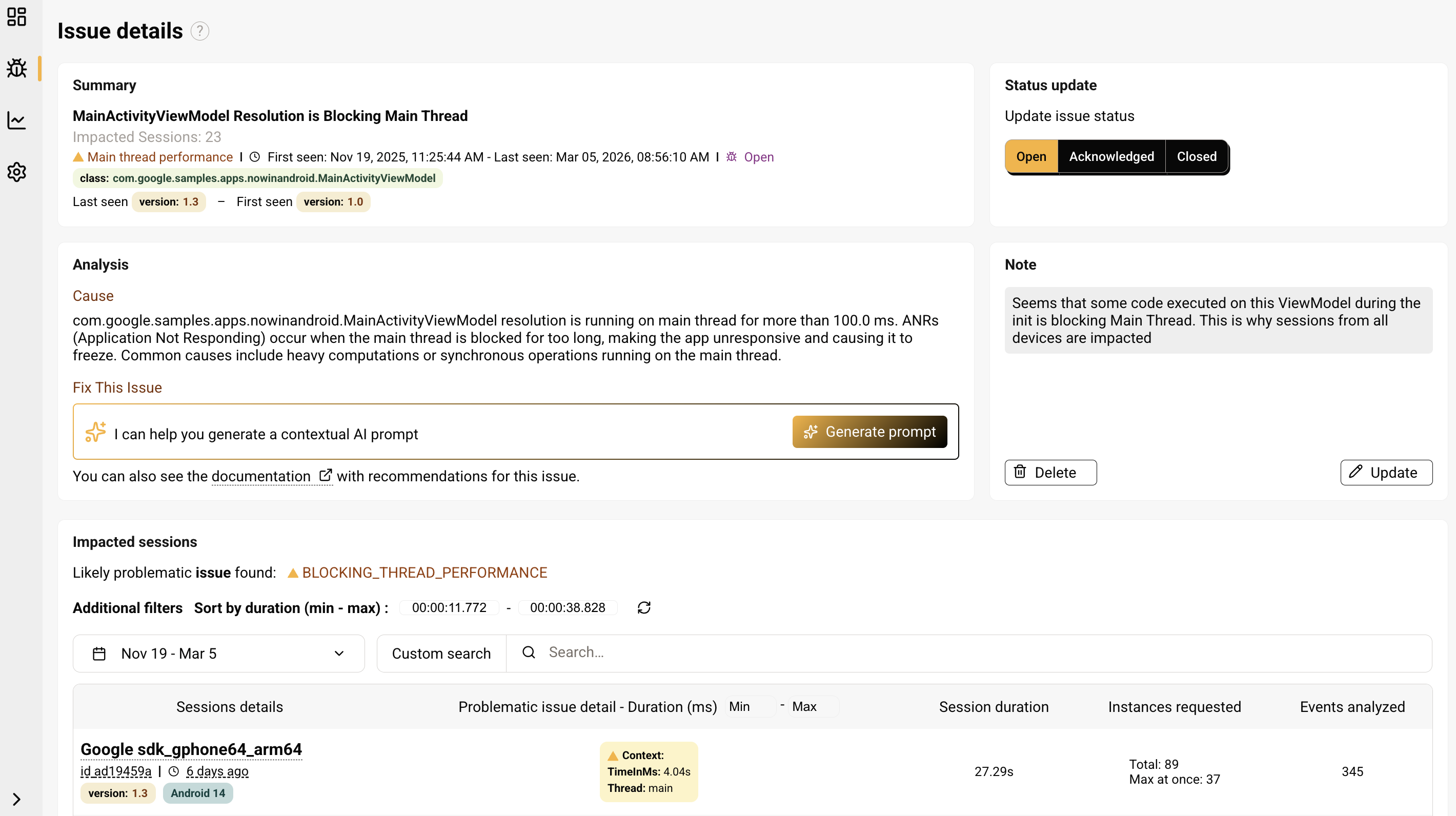 - Issue type (crash, ANR, or other performance issue)