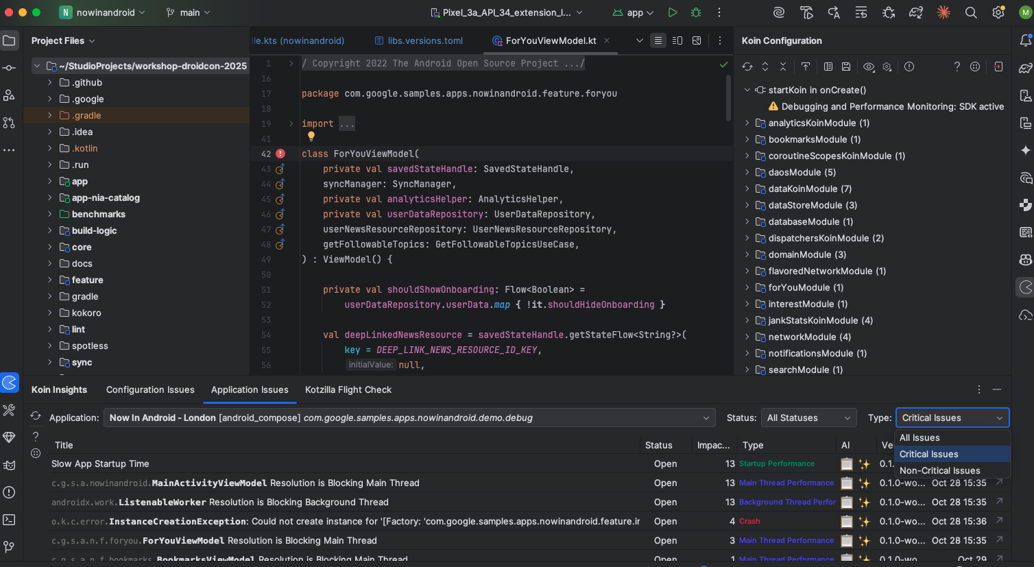The Koin IDE Plugin integrates with the Kotzilla Console, allowing you to view and address issues directly within your development environment. The plugin includes an Application Issues view that displays detected issues and impacted user sessions. For further investigation, you can explore issue details in the Kotzilla Console.