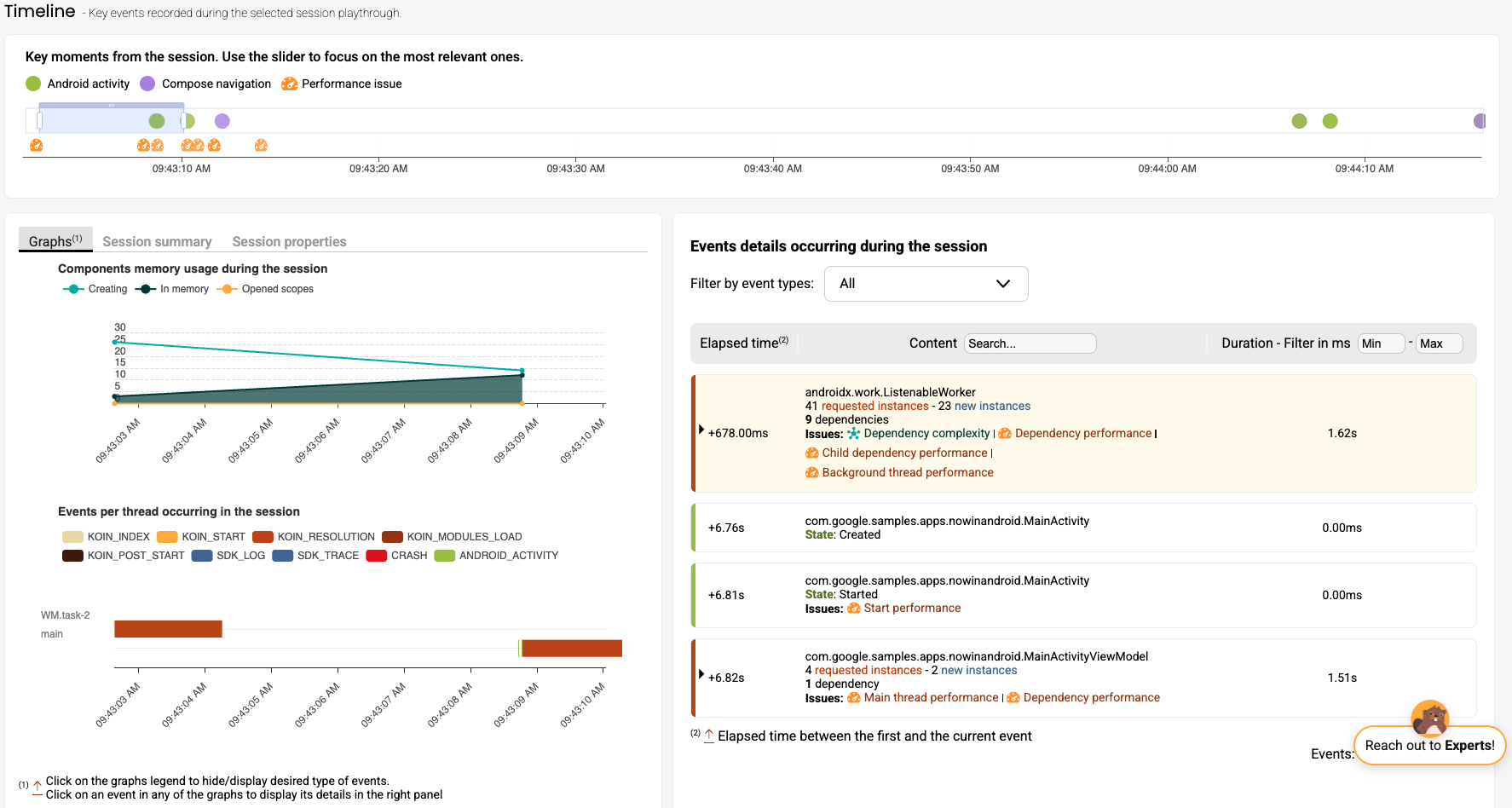 Use the Timeline view to analyze resolution times and dependency graphs for each user session. The SDK API enables custom instrumentation to trace and profile slow dependencies for deeper investigation.