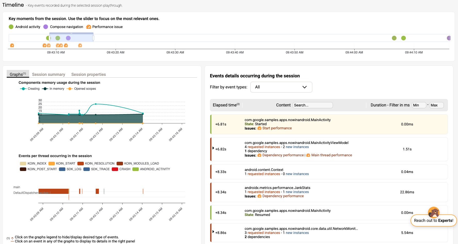 The information you log will appear in the user sessions Timeline view of the Kotzilla Console, providing a clear, chronological view of events to help troubleshooting.