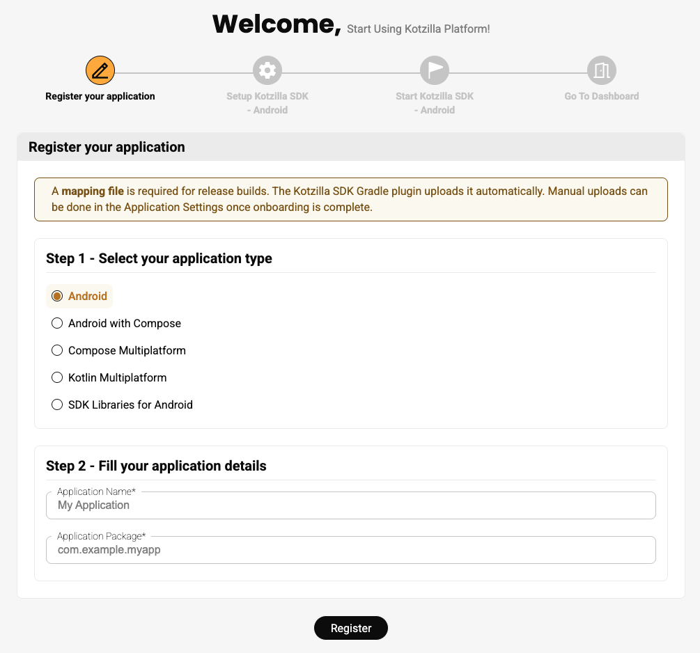 A Manual Setup button will appear for any application. Clicking it redirects you to the Kotzilla Console onboarding page, where you can register your application, select the app type, and enter the required details.