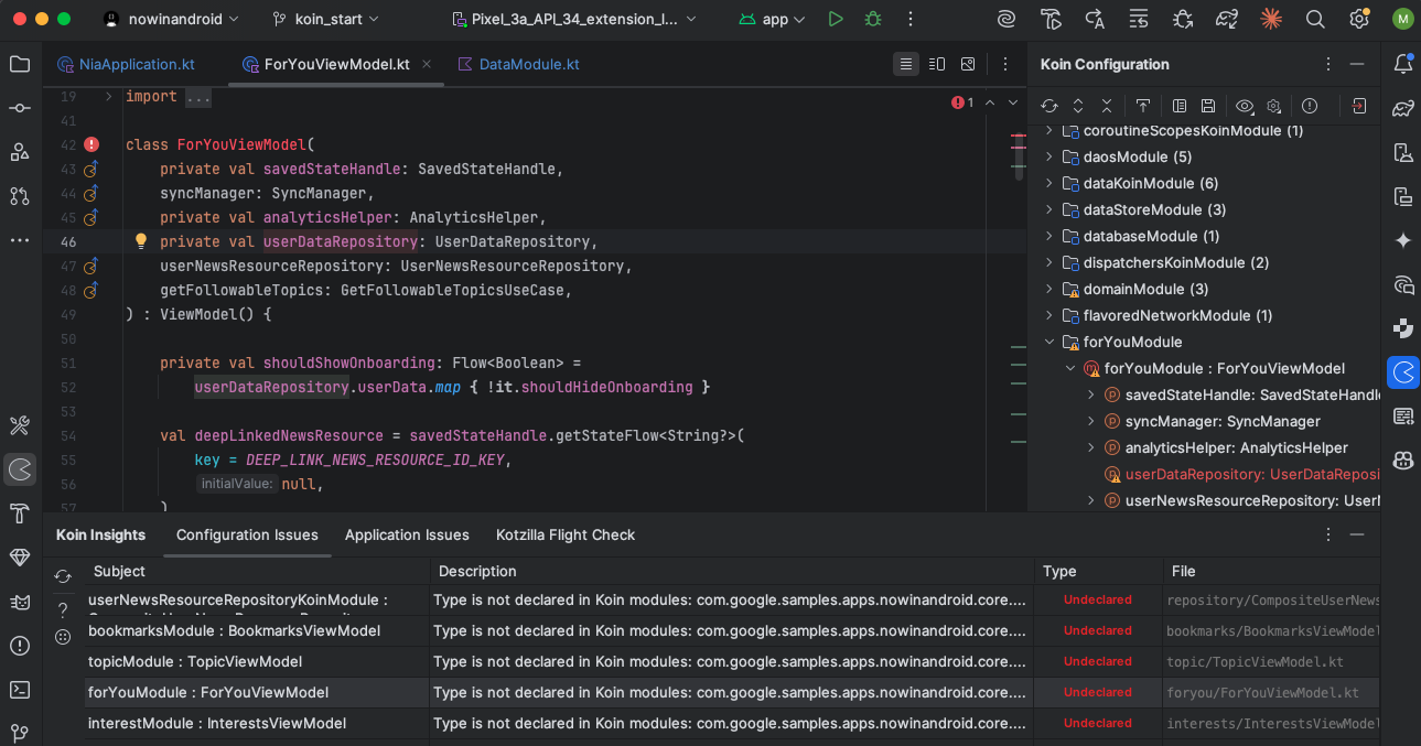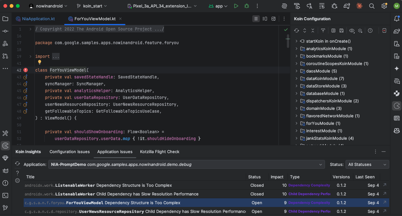 You should also notice the Koin Insights view on the left side, giving you full access to both Koin configuration and app issues detected. See below an example of app with configuration issues detected: