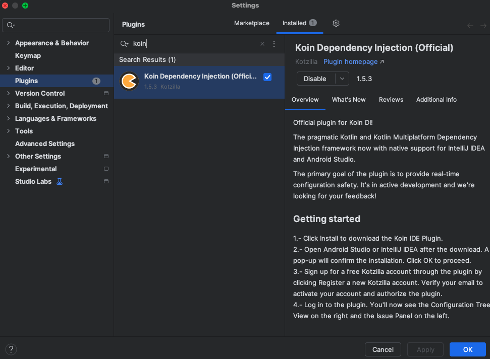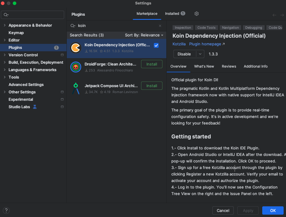 Follow the steps below to install the Koin IDE Plugin and start debugging and monitoring your Kotlin apps directly from Android Studio or IntelliJ IDEA.