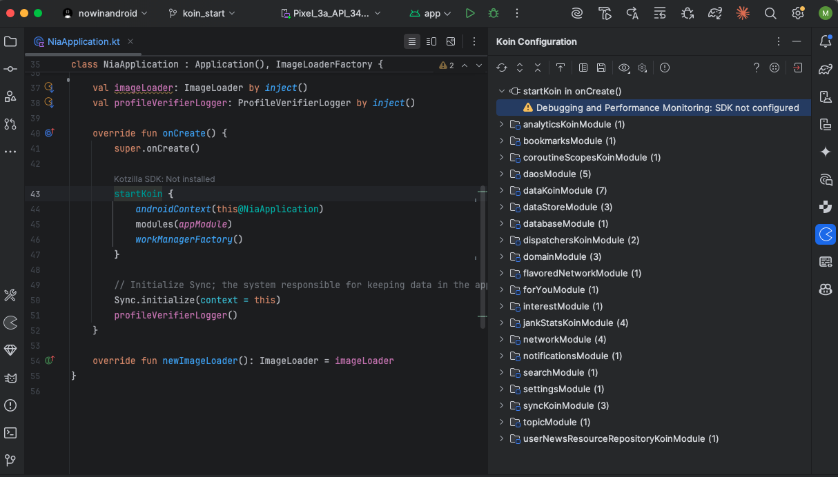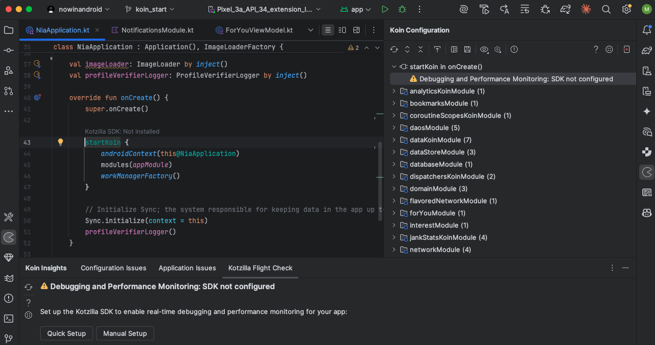 To start debugging your app and resolving issues like performance bottlenecks, thread blockages, or complex dependency graphs, ensure the Kotzilla SDK is correctly set up. The plugin checks SDK configuration in real time and shows a status indicator in the Koin configuration view.