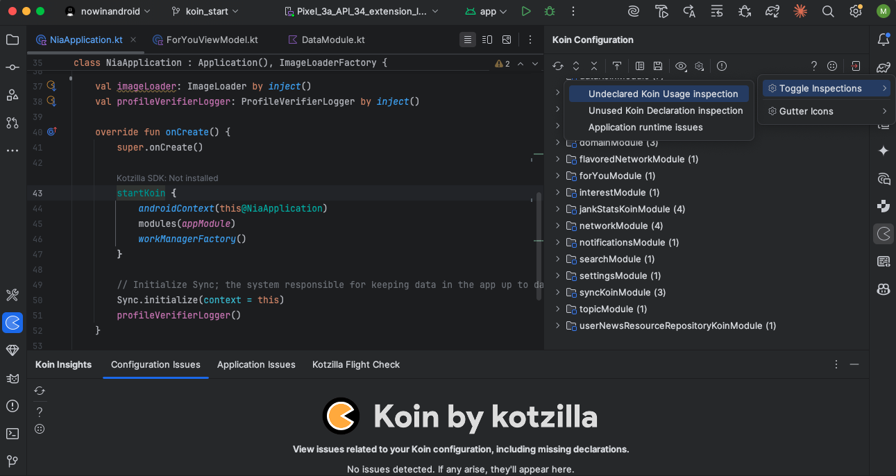 If desired, configuration issue inspections can be disabled. Go to the Koin Settings-> Toggle Inspections menu