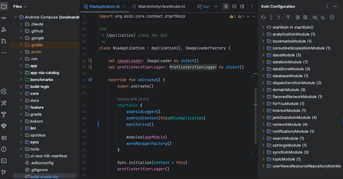 startKoin in onCreate()entry to see that the SDK initialization has been added to yourNiaApplication.ktclass.