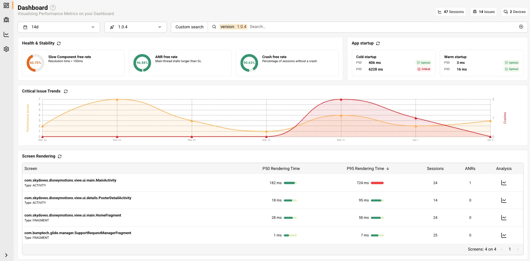 - Overview KPIs - P50 and P95 rendering time, sessions affected, ANRs, and status indicators.