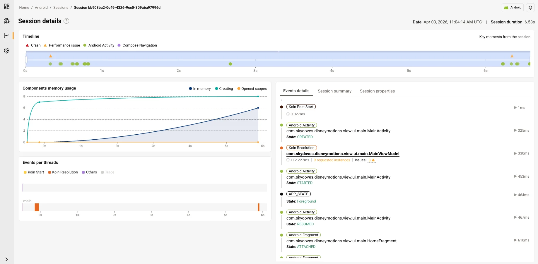 The SDK now computes and structures timeline data on-device. Instead of forwarding raw Koin logs, the SDK builds structured timeline events (dependency resolutions, activity lifecycle, crashes) and assembles resolution dependency trees in real-time. This means the data arriving in the Console is already organized and contextualized, resulting in faster issue detection and more accurate root cause analysis. This also eliminates false positives in dependency chain detection that occurred when the server had to reconstruct the graph from raw logs.