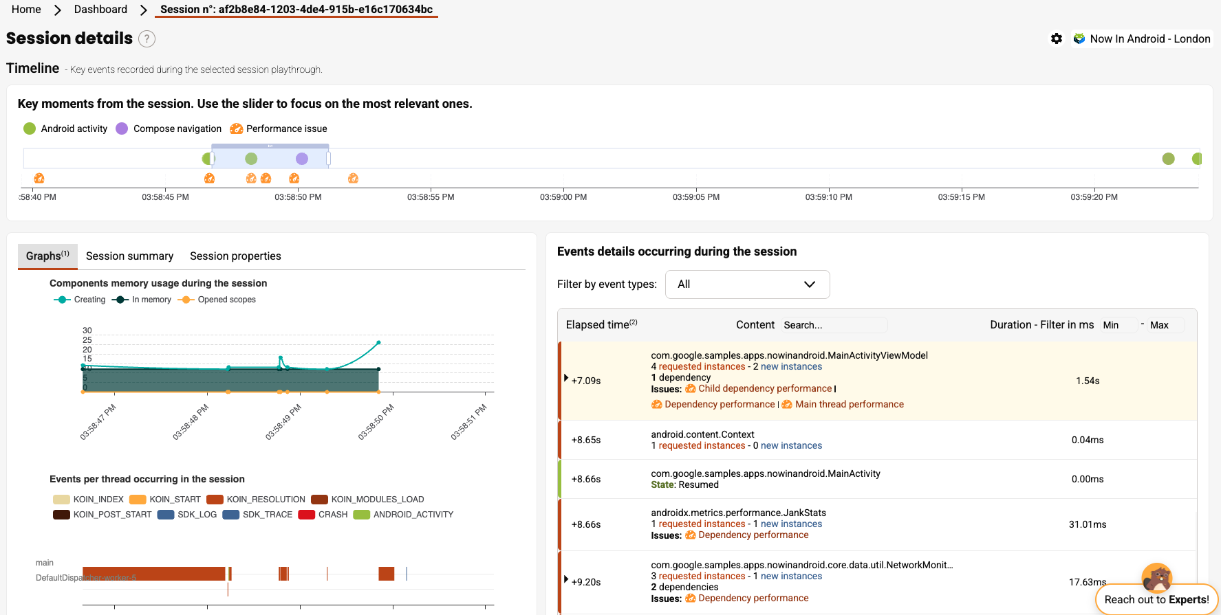 Combined with the Console Timeline view, this gives you and your team full visibility into Compose app behavior, complementing existing Android monitoring.