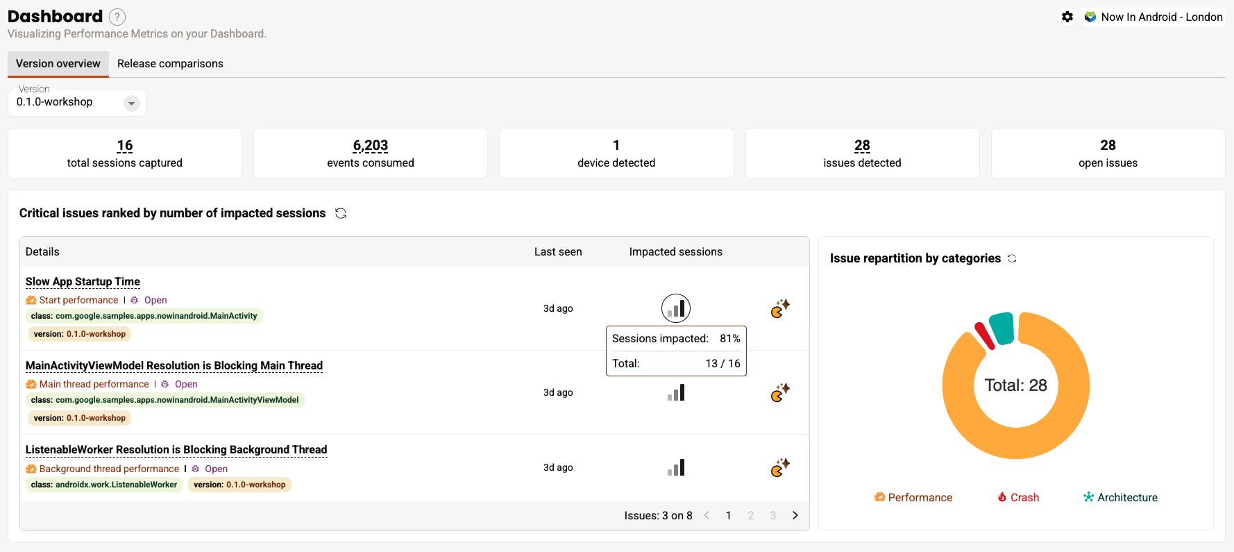 - An overview with key highlights of a particular version of an app: sessions analyzed, events consumed, different devices, as well as # issues and crashes detected.