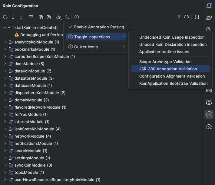 - New validation inspections for: Android scope usage, JSR-330 correctness, Configuration alignment, @KoinApplication uniqueness